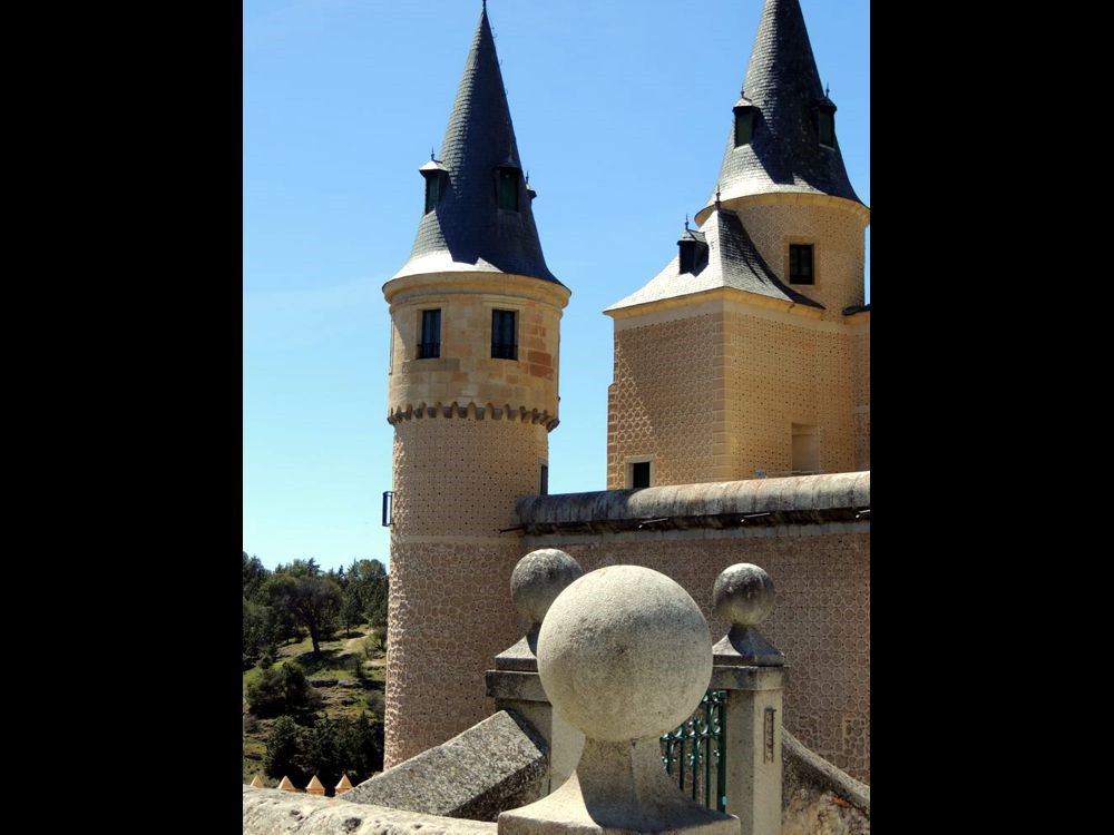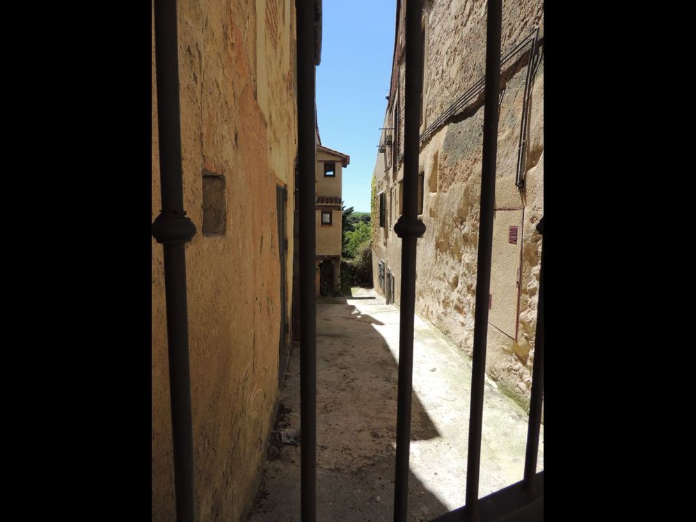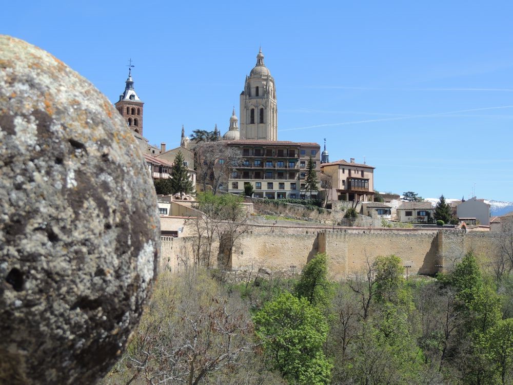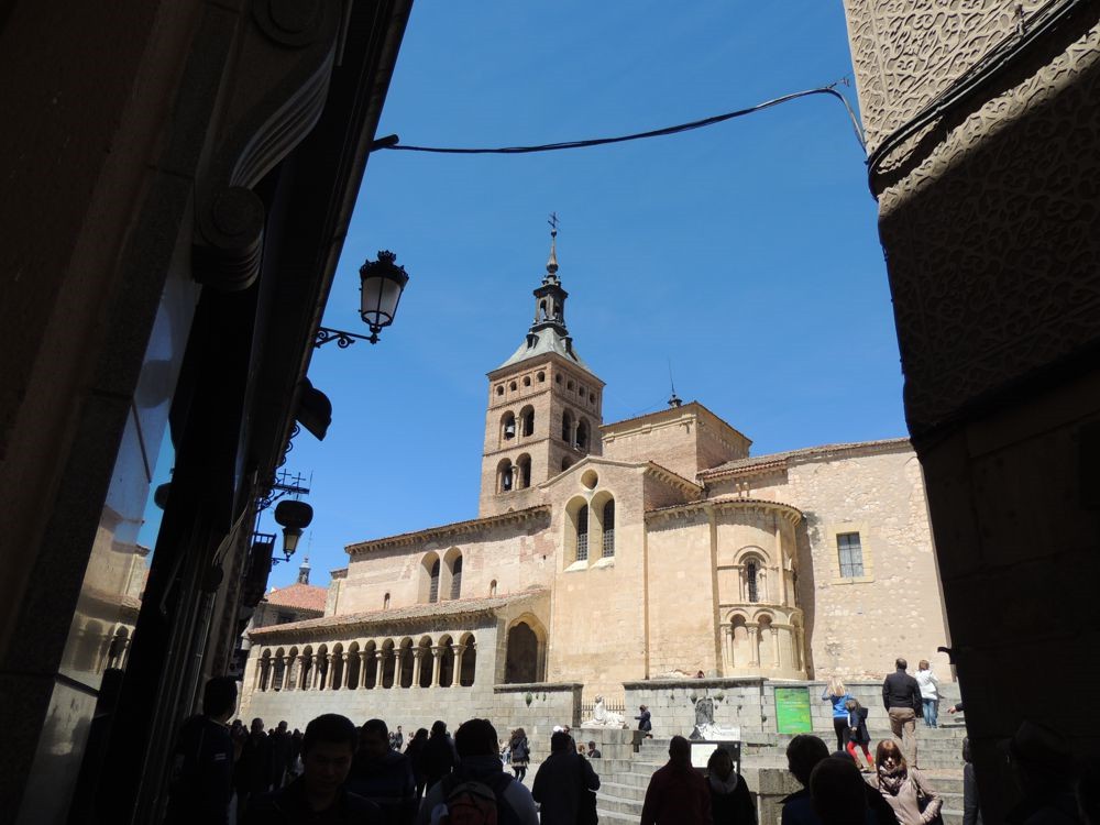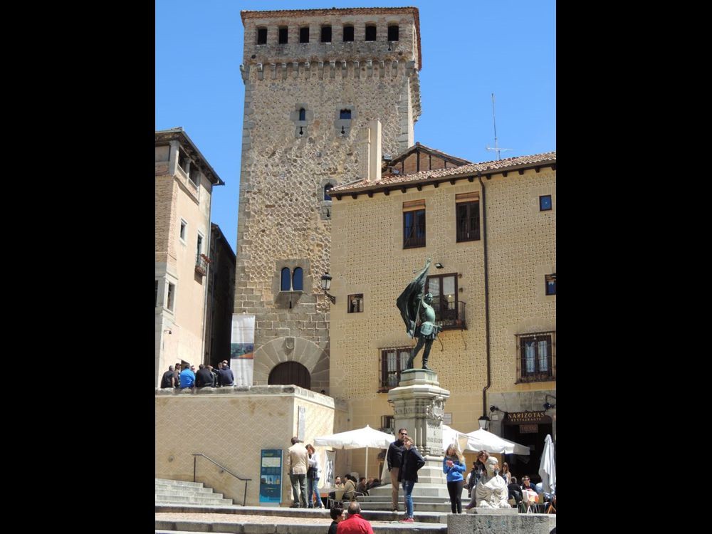 After seeing the aquaduct, I thought I should get back towards the castle as soon as possible to get a better look at it. As often is the case, even when you're taking the same route back, there's things you've missed the first time past. That certainly was true as I walked down Calle Cervantes and Calle Juan Bravo towards the main square. I stopped at a cafe in Plaza Mayor for a quick bite to eat before going back down Calle Daoiz to the castle. I took some time to check out the the Plaza de la Merced with its pretty fountain and the Iglesia de San Andreas beside it. I arrived at the castle with some time to look at its exterior more closely although not enough time to enter. One set of towers was either being repaired or cleaned but, keeping that in mind, the castle didn't quite look like the pictures I'd seen of it. On our ride out of town, it became clear why. From the road and far below the cliff it's built on, the view we see in online pictures is evident. Lucky for me, Sergi was taking pictures of us as we rode by that very spot and the picture of me passing the castle is definitely one I'll frame.