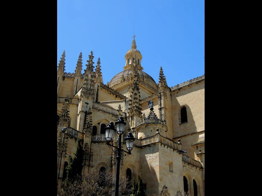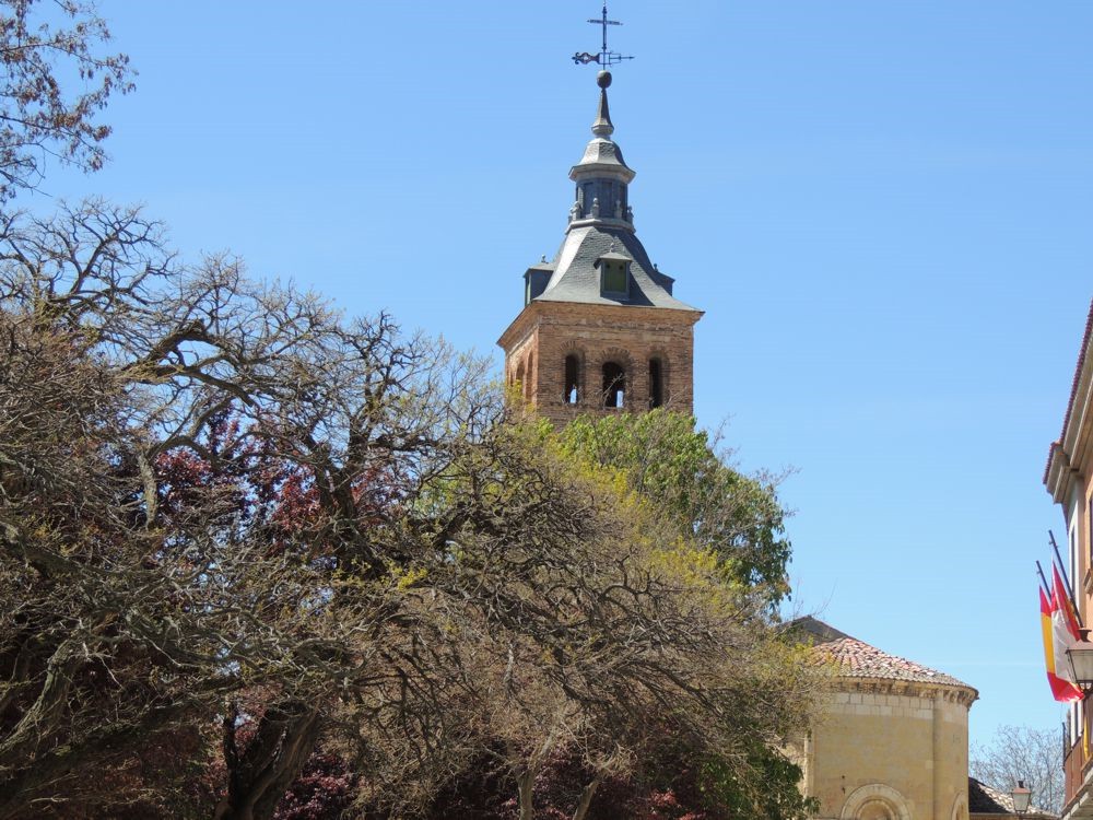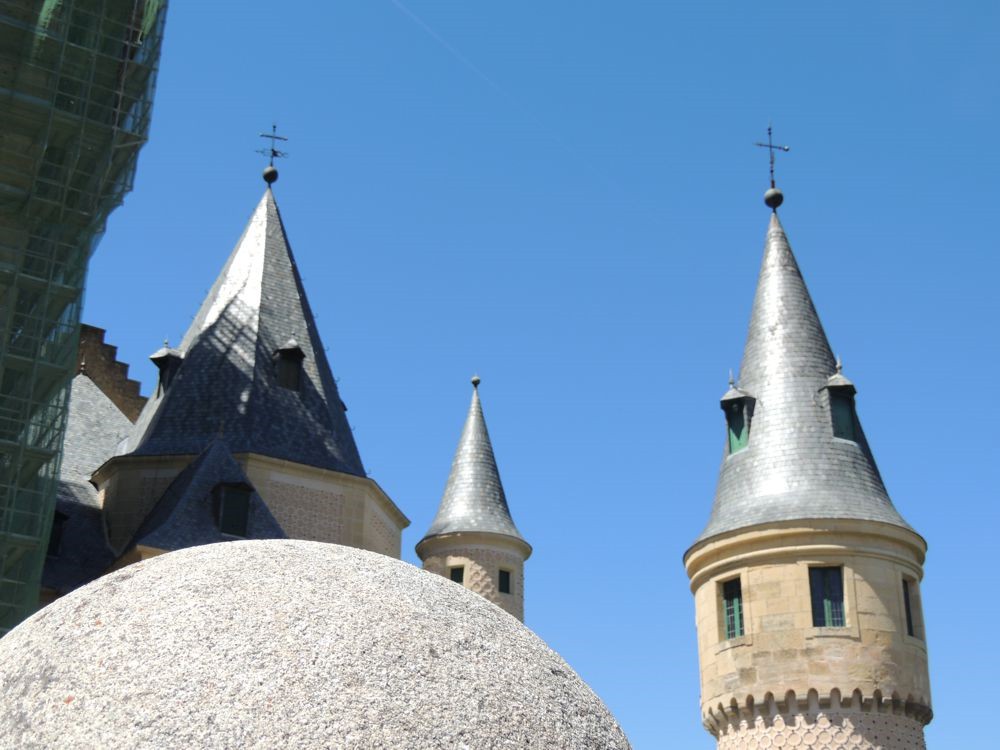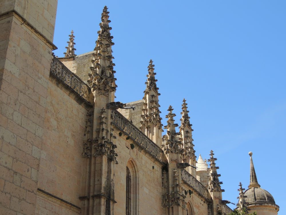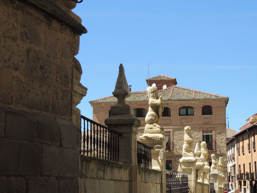 After seeing the aquaduct, I thought I should get back towards the castle as soon as possible to get a better look at it. As often is the case, even when you're taking the same route back, there's things you've missed the first time past. That certainly was true as I walked down Calle Cervantes and Calle Juan Bravo towards the main square. I stopped at a cafe in Plaza Mayor for a quick bite to eat before going back down Calle Daoiz to the castle. I took some time to check out the the Plaza de la Merced with its pretty fountain and the Iglesia de San Andreas beside it. I arrived at the castle with some time to look at its exterior more closely although not enough time to enter. One set of towers was either being repaired or cleaned but, keeping that in mind, the castle didn't quite look like the pictures I'd seen of it. On our ride out of town, it became clear why. From the road and far below the cliff it's built on, the view we see in online pictures is evident. Lucky for me, Sergi was taking pictures of us as we rode by that very spot and the picture of me passing the castle is definitely one I'll frame.