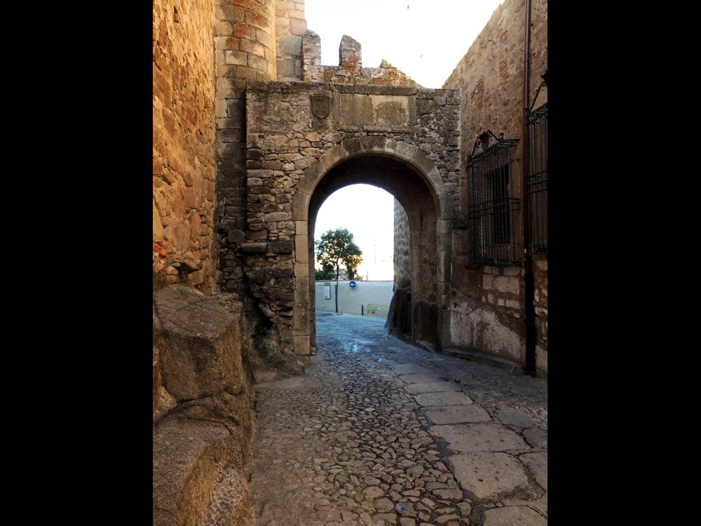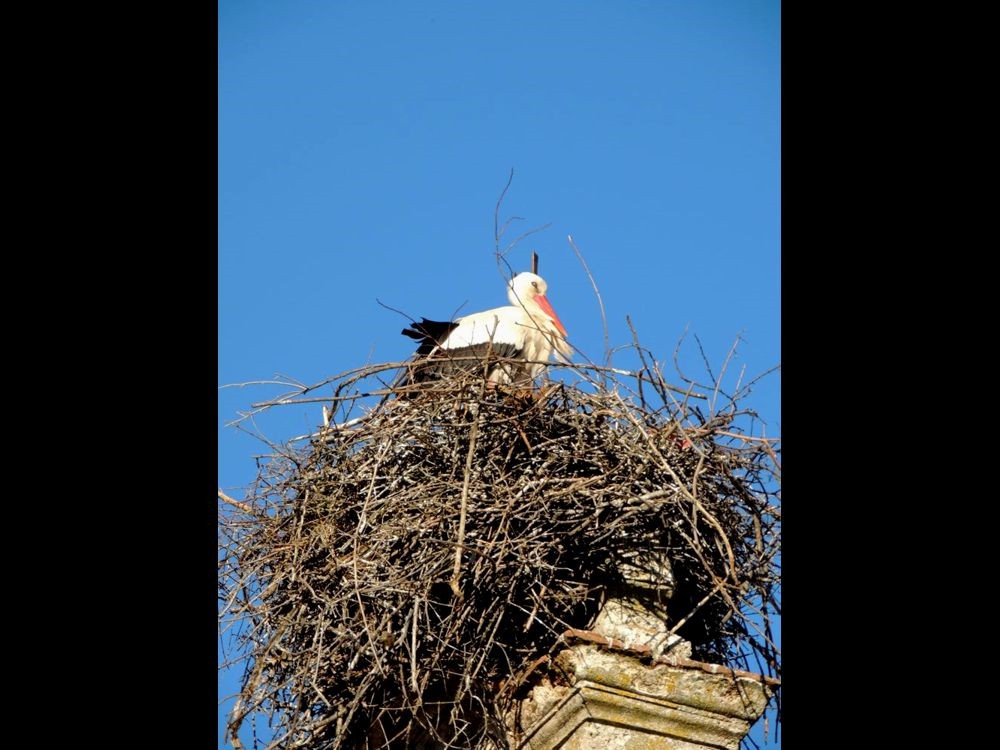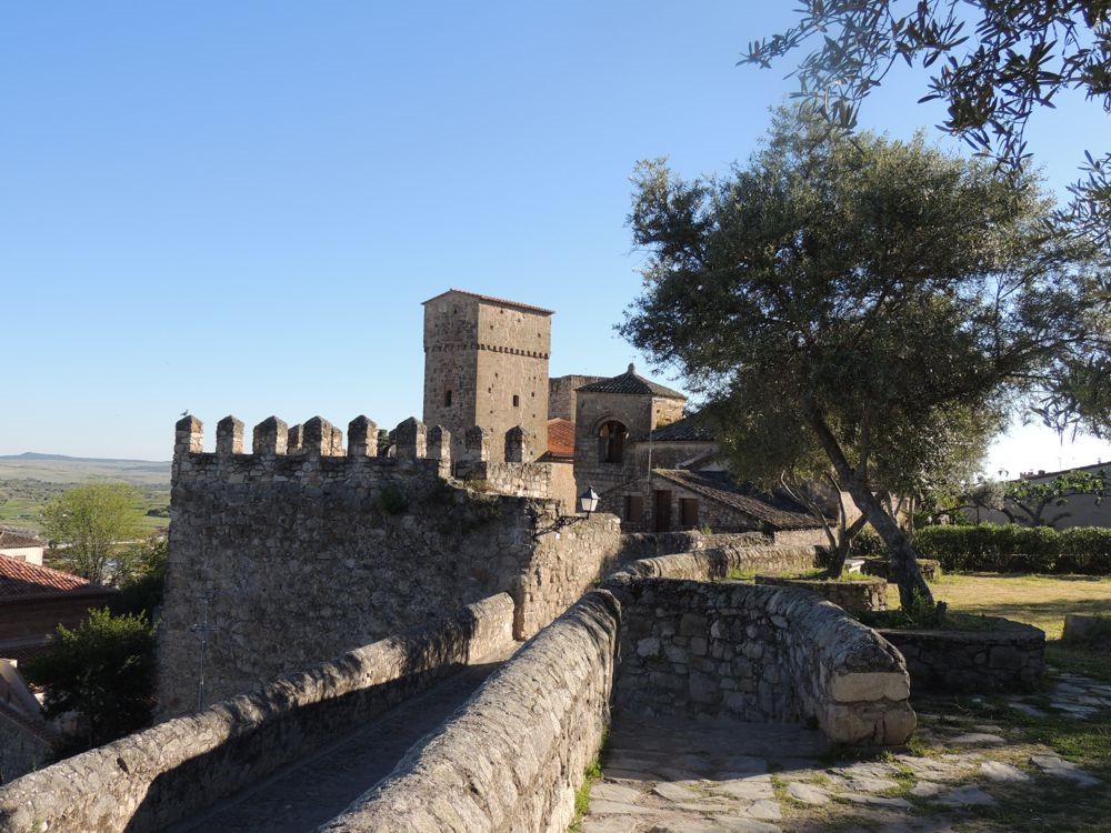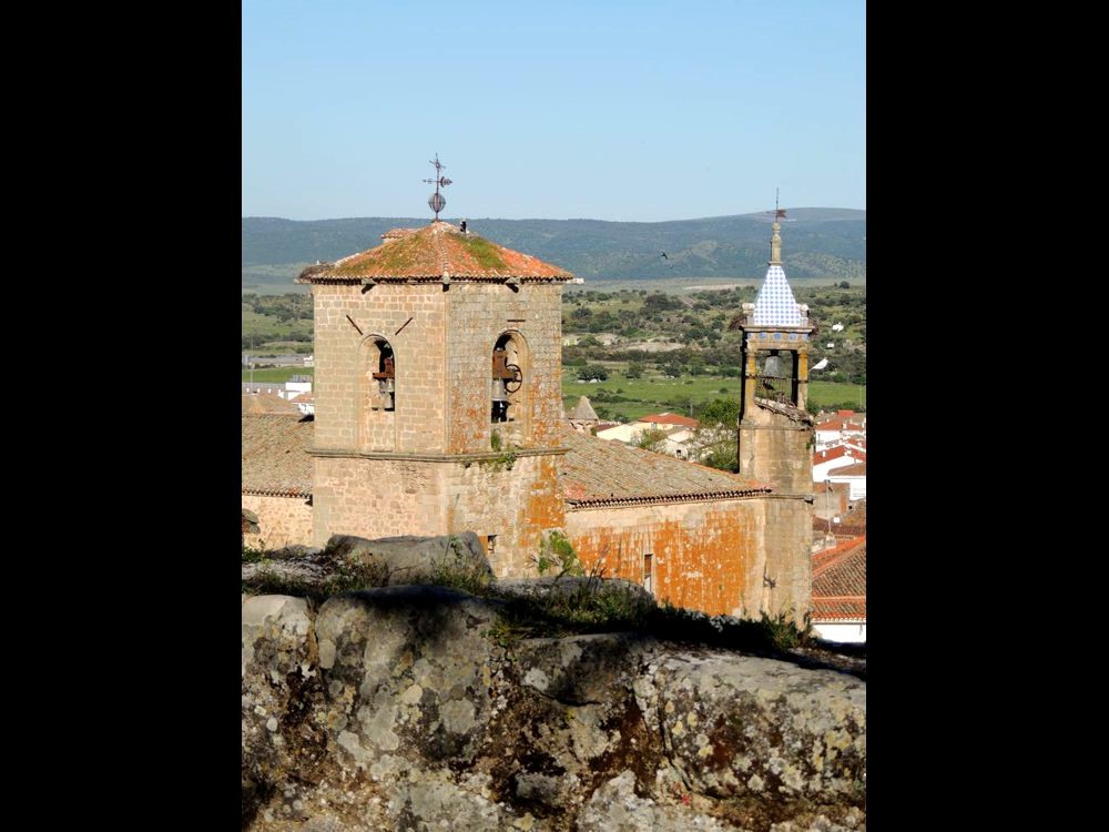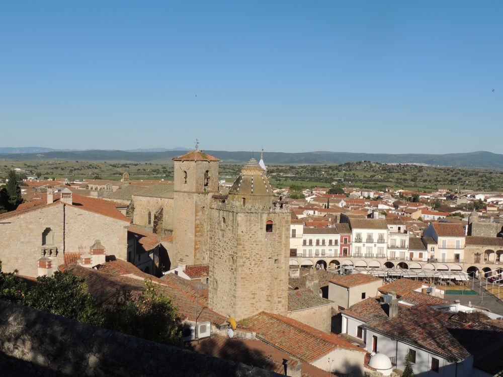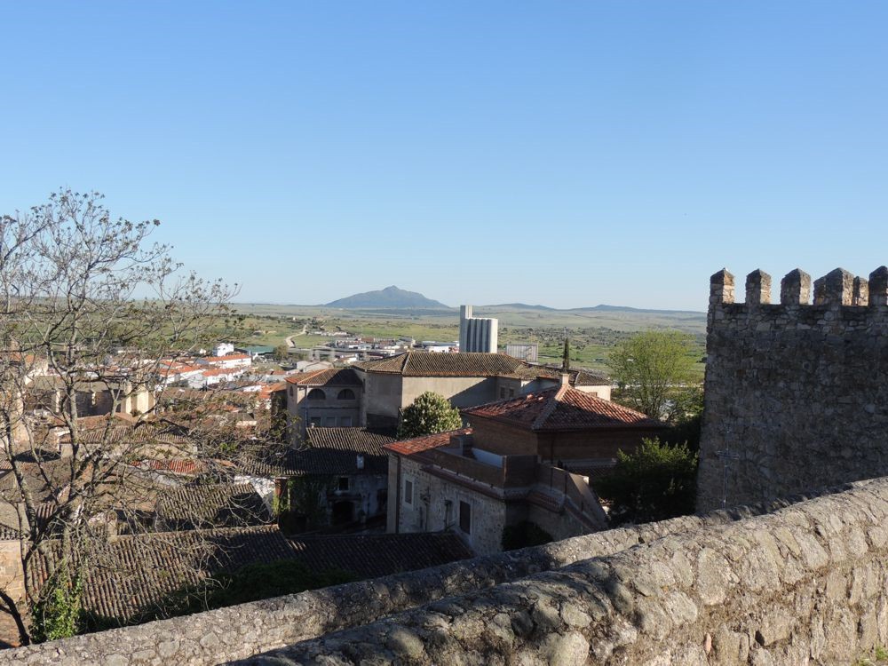 Trujillo's Parador was once a convent. A large building with a central courtyard, there were many artifacts from times past in the hallways. There were garden spaces which would have been perfect for times of contemplation. My first attempt at leaving the Parador to go and explore the town was unsuccessful because it was difficult to figure out the correct direction to travel once outside. In my first attempt at finding my way, I went down a street which gave me a view of the town walls and of the castle but I knew that the main square was not in that direction. I tried another direction but because the streets were narrow and the buildings two and three stories tall, I couldn't tell if I was even close to going where I wanted to. On each street I saw different dogs... two greeted me from their balcony... one from a garden which was above street level. The dog that gave me giggles was the one that I found in a home just by the Parador. The dog barked at my passing but was hidden behind a gate and a footed screen. I just told it "It's okay, buddy" and it crawled under the screen to greet me at the gate. Too funny! I couldn't help but to sketch him... what a character! Soon after I completed a preliminary sketch, I went back into the Parador for a map of Trujillo... much good it did me. I was STILL confused as to which way to go because the streets went at all angles and didn't seem to match up with the map. Solution: I asked a couple of kids just coming home from school (I assume by the book bags). They directed me towards the church - Iglesia de San Martin - which was on the main square. A main feature of (you guessed it!) Plaza Mayor was the bronze statue of conquistador Francisco Pizarro on horseback. At the statue I met a Spanish family on vacation. I was able to help them by taking their photo towards Palacio del Marques de la Conquista and they helped me with directions to the castle plus an explanation of the sights I was seeing in the square. My walk to the castle started on the street behind the Oficino de Turismo (Casa de la Cadena y Torre de Alfiler). You entered the gated part of the city through the Puerto de Santiago. A sharp right turn led you further up the hill to the Castillo Arabe Trujillo. From the grounds in front of the castle, you could look out over the walls to the Plaza Mayor and far beyond. On the tops of different spires and towers, more huge nests (and their occupants) could easily be seen. It was time to return to the Parador for dinner. Looking at things from a reverse angle as I retraced my steps, I realized that there was a lot I'd missed on the walk up to the castle.