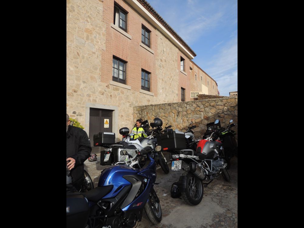 I'll always remember the Parador de Trujillo as the place that didn't want us to go. Trying to exit out of the large garage door from inside seemed impossible at first. Then someone was able to communicate (with the front desk?) to get them to open it long enough for us to get out. Then it was the automatic gate. The two people on bikes barely made it out before it shut on them (electric eye maybe didn't register them very well??). When it was our turn, Sergi missed getting the electronic eye to see us. He had to run out of the van and right back in with me close behind so it wouldn't shut on him or me.
