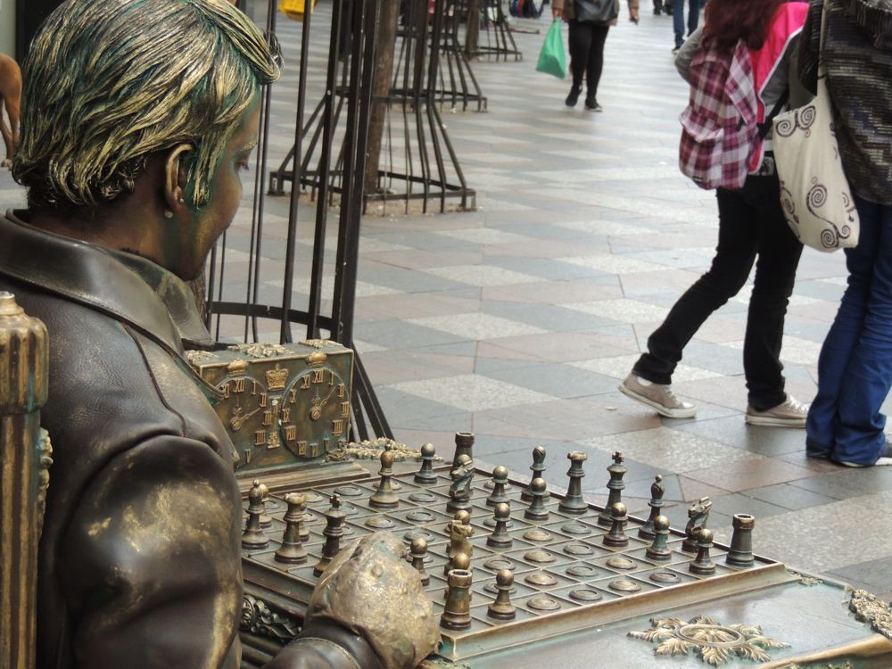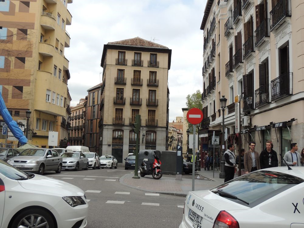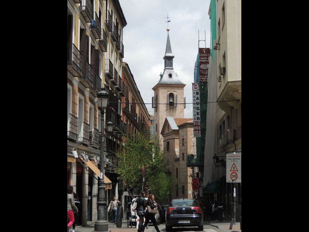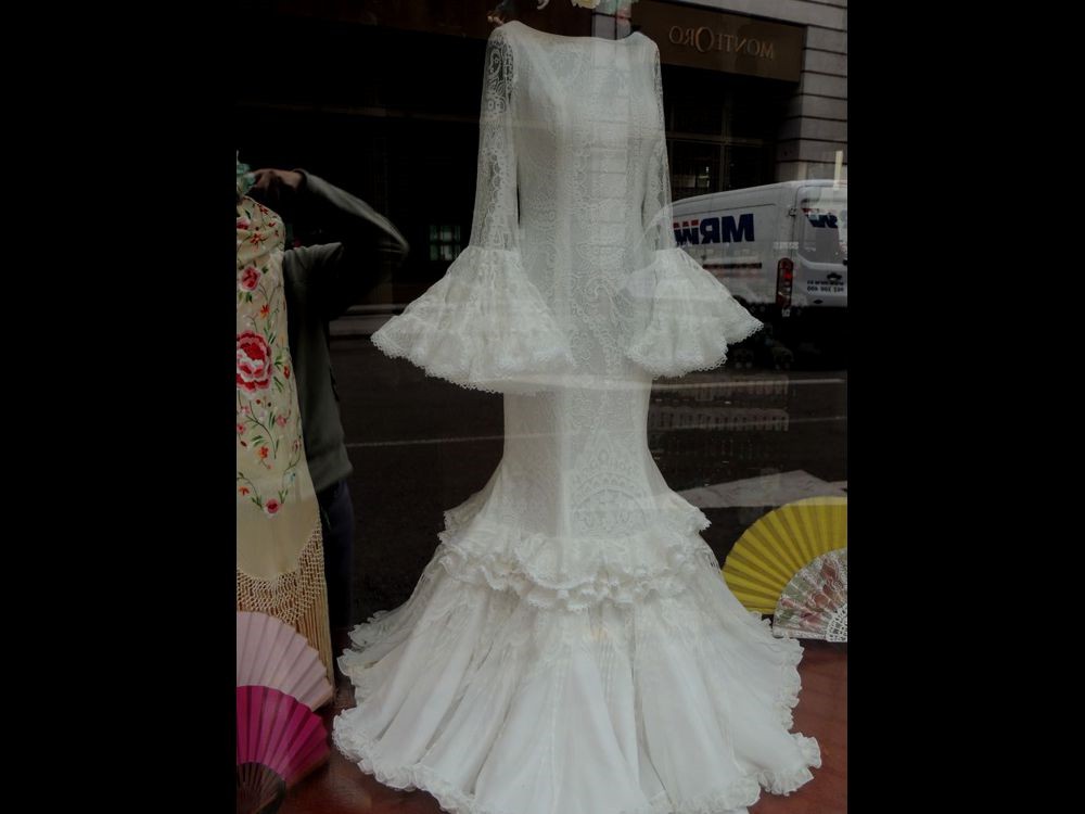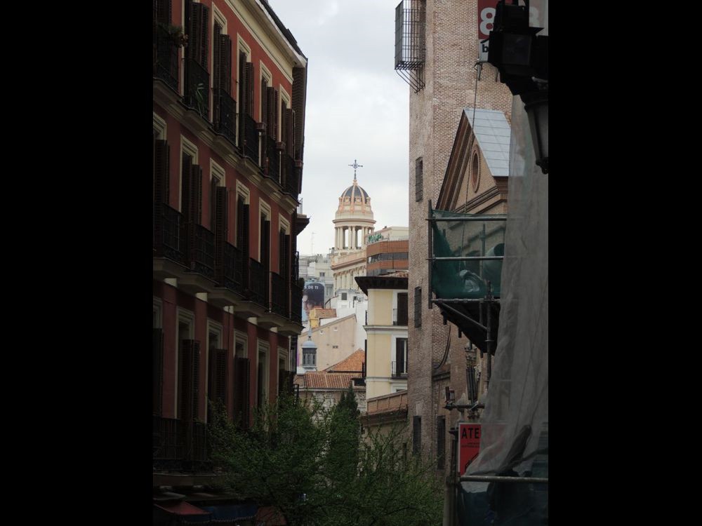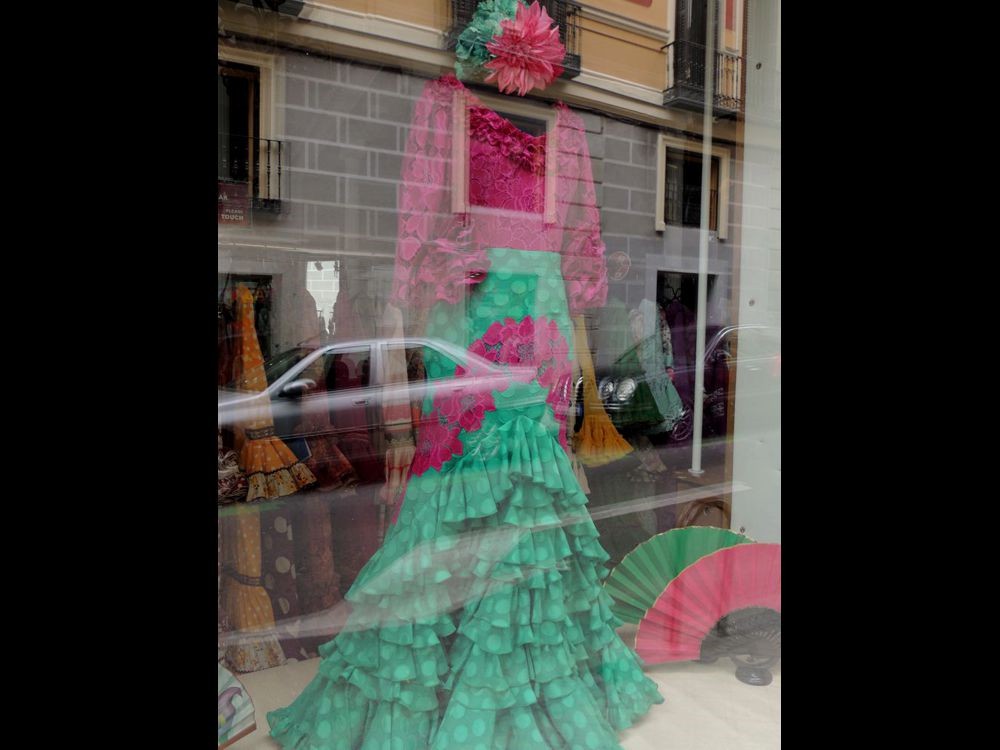 After lunch, I walked down Calle Mayor to Puerto del Sol. Same route but I noticed new things. Then I took a trip down a side street in order to visit a shop selling traditional Spanish clothing... Maty! On the way I encountered a statue? a performance artist?? The guy was SO perfectly like a statue, it took awhile to decide. He FINALLY blinked. It was the only way to know! When I got to Maty, it was unfortunately closed for lunch (1:45 - 4:30) but I was able to peek into some windows to see some wonderful things. Now headed for my hostal, I noted an unusual delivery method for a store that would NEVER deliver in Canada and a computer store which is always busy whether in Spain or Canada or anywhere else I've been. I also found out how serious people from Madrid are about their dogs. The little pictured was imported from California becuase his owner just had to have one!