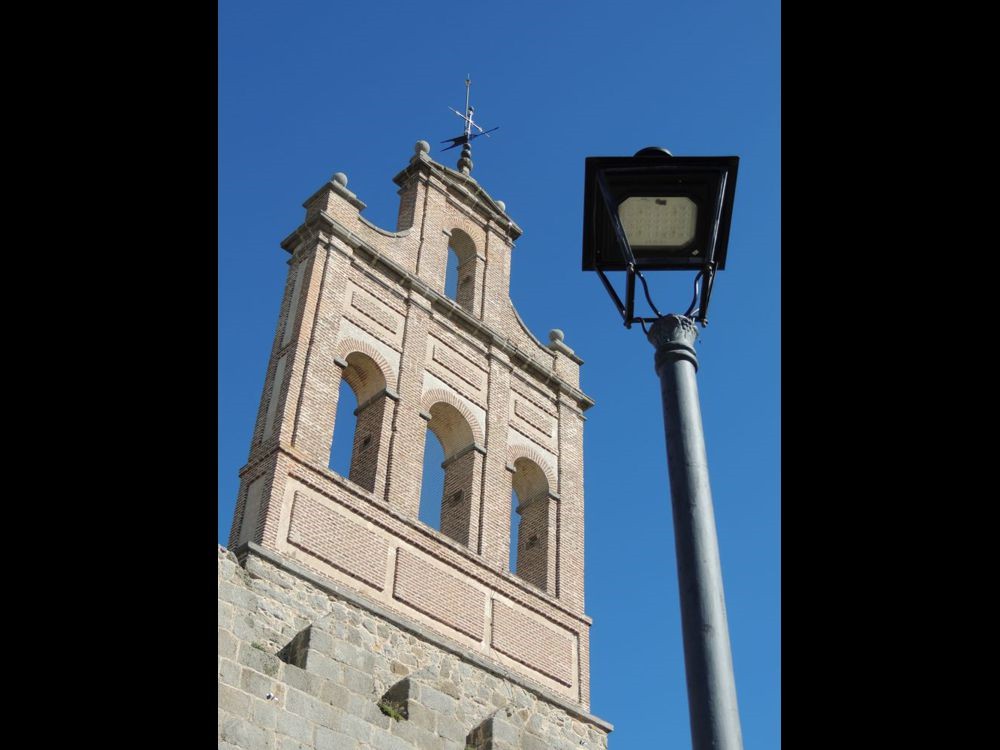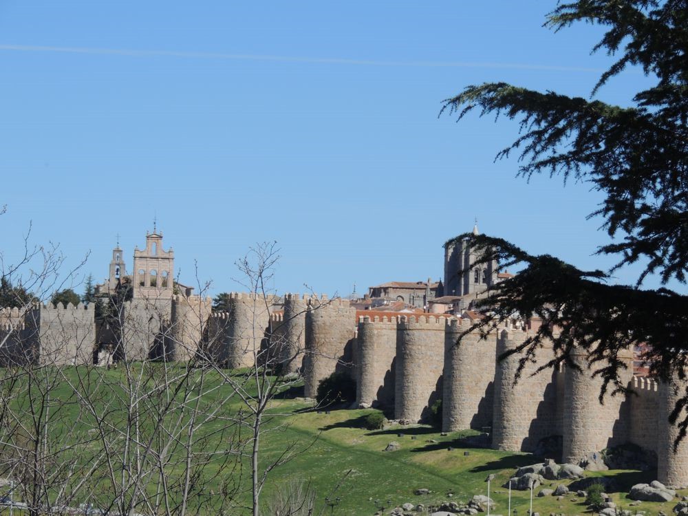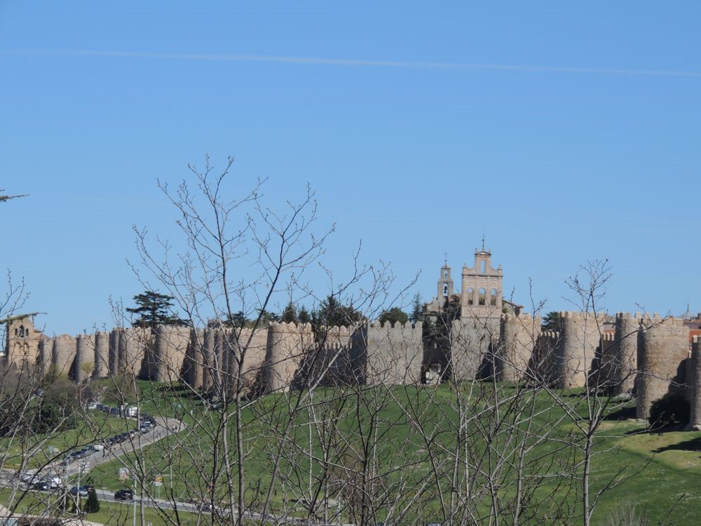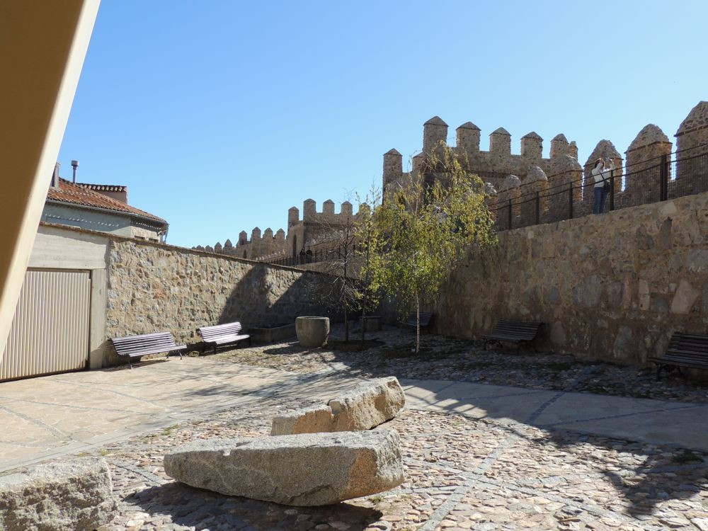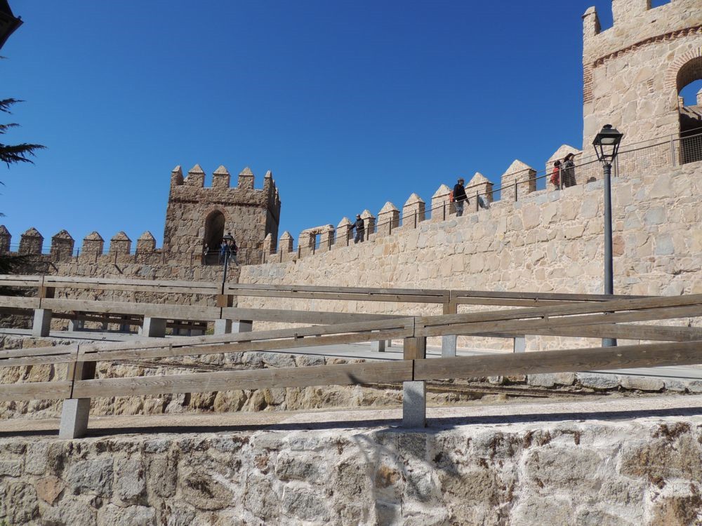 When we arrived in Avila we stopped for gas. From the station, we could see the gated city of Avila. We rode to a gate on the north side of the wall to enter and arrive almost immediately at the Parador de Avila. The Palace Piedras Albas was converted into a Parador in 1966. It's layout was somewhat confusing because the rooms have been created in the structures various nooks and crannies. The hallways and lobby display artifacts from the times the Palace was still just that. After puting my bag in my room, I grabbed my camera and went outside to see if I could find a way to travel up and along the walls of the city. Although I got some nice views, I couldn't figure out how to get up to the paths that I could see people walking so I went back into the Parador where Vicky, a college student from China taking a degree in tourism, gave me directions on how to find one of three points of access to the wall. That led me down Marques de Santa Domingo where I was able to climb a ramp near the north west corner of the wall and arrive atop the wall.