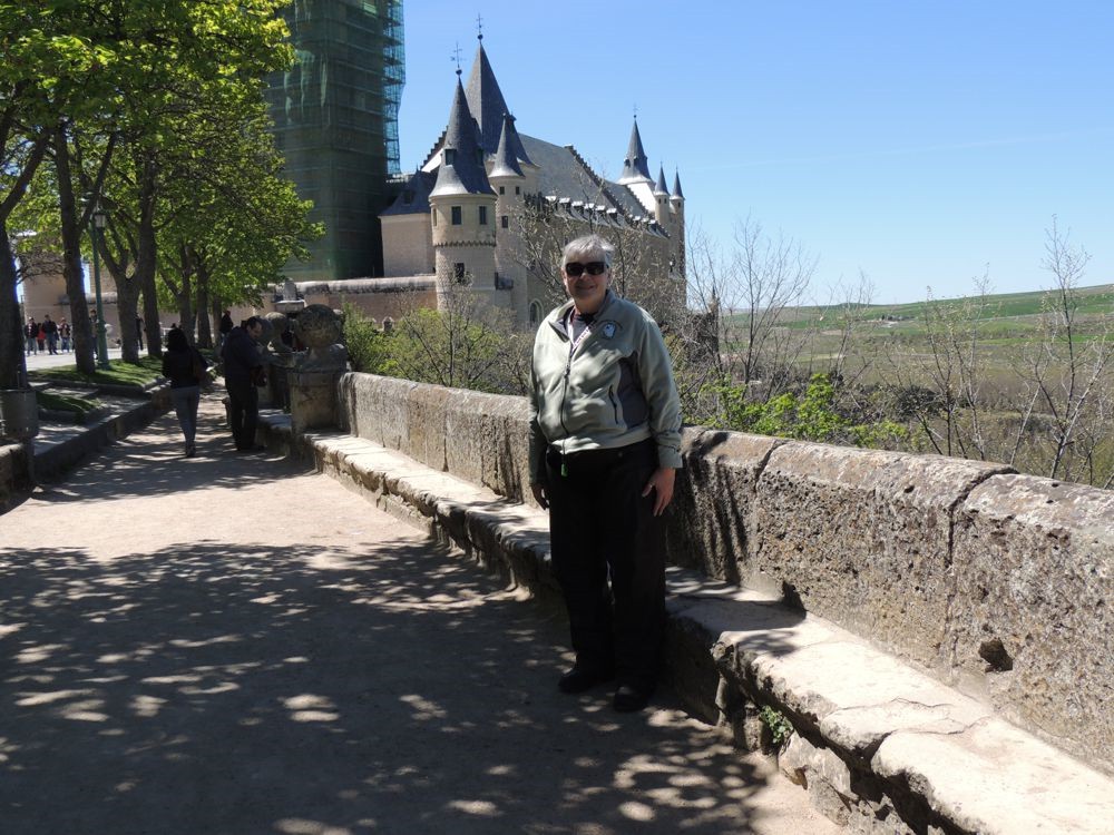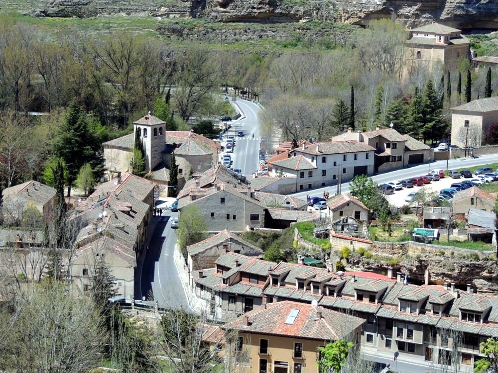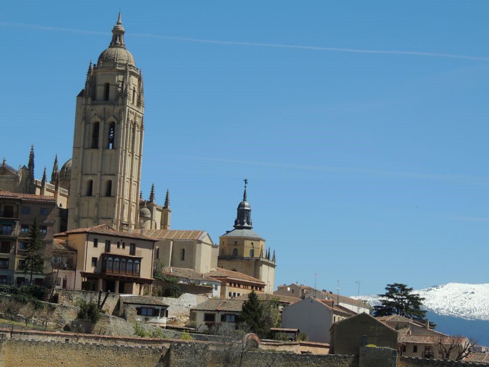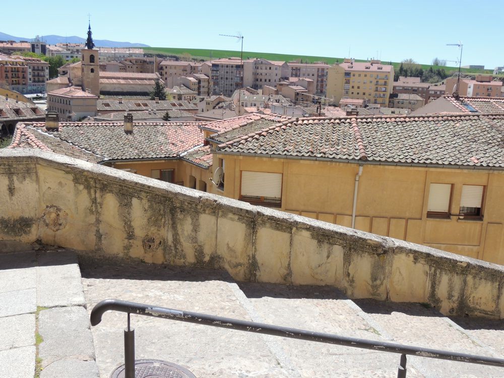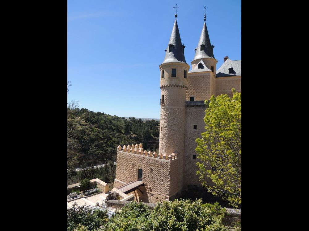 After seeing the aquaduct, I thought I should get back towards the castle as soon as possible to get a better look at it. As often is the case, even when you're taking the same route back, there's things you've missed the first time past. That certainly was true as I walked down Calle Cervantes and Calle Juan Bravo towards the main square. I stopped at a cafe in Plaza Mayor for a quick bite to eat before going back down Calle Daoiz to the castle. I took some time to check out the the Plaza de la Merced with its pretty fountain and the Iglesia de San Andreas beside it. I arrived at the castle with some time to look at its exterior more closely although not enough time to enter. One set of towers was either being repaired or cleaned but, keeping that in mind, the castle didn't quite look like the pictures I'd seen of it. On our ride out of town, it became clear why. From the road and far below the cliff it's built on, the view we see in online pictures is evident. Lucky for me, Sergi was taking pictures of us as we rode by that very spot and the picture of me passing the castle is definitely one I'll frame.