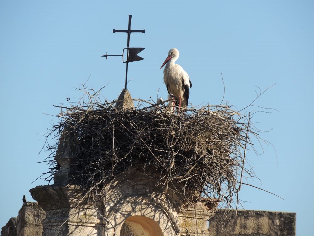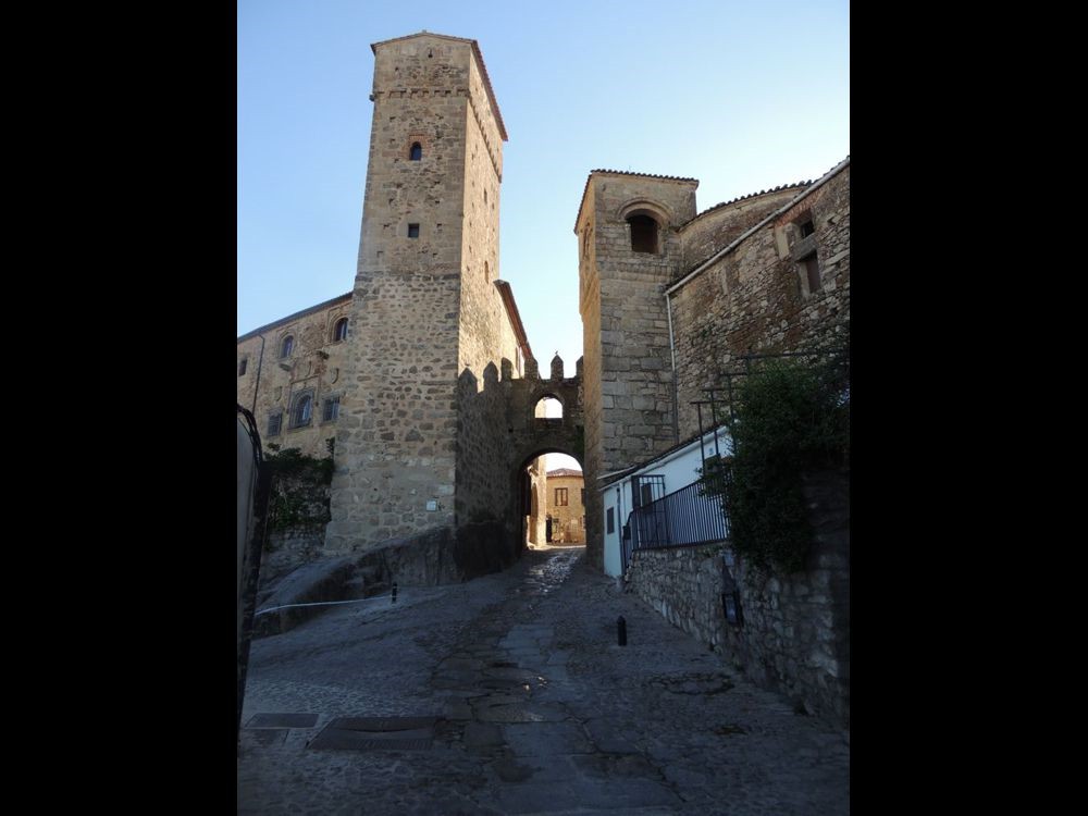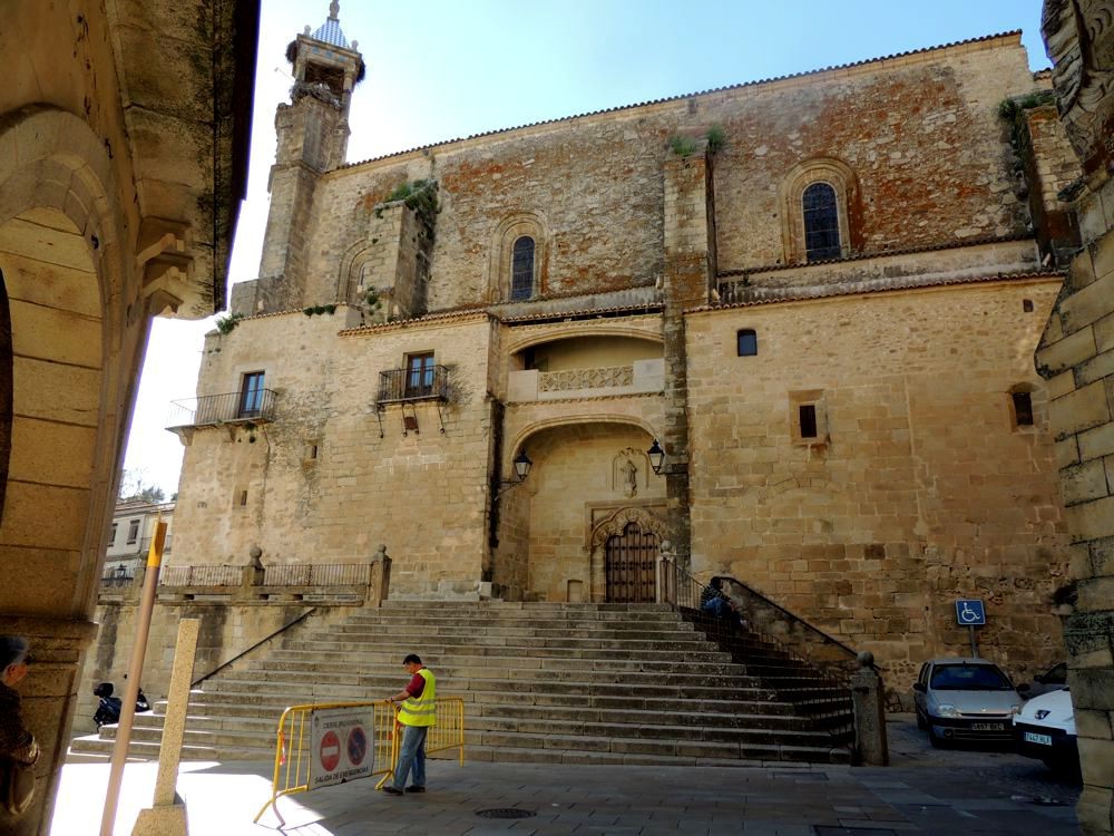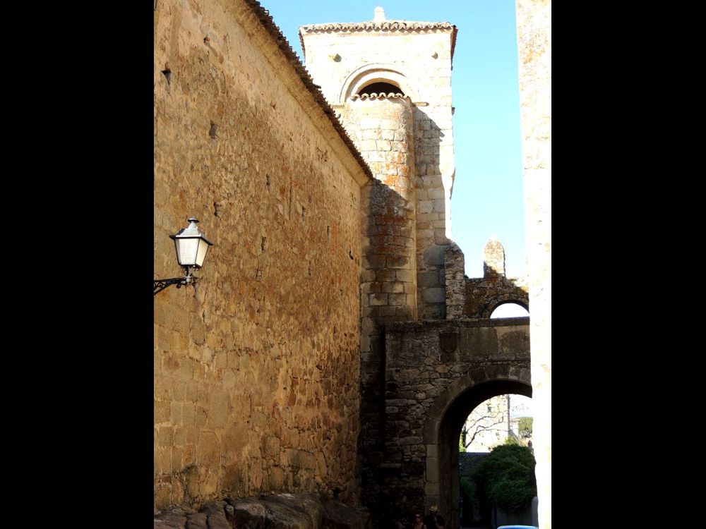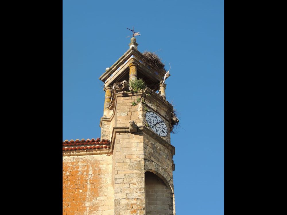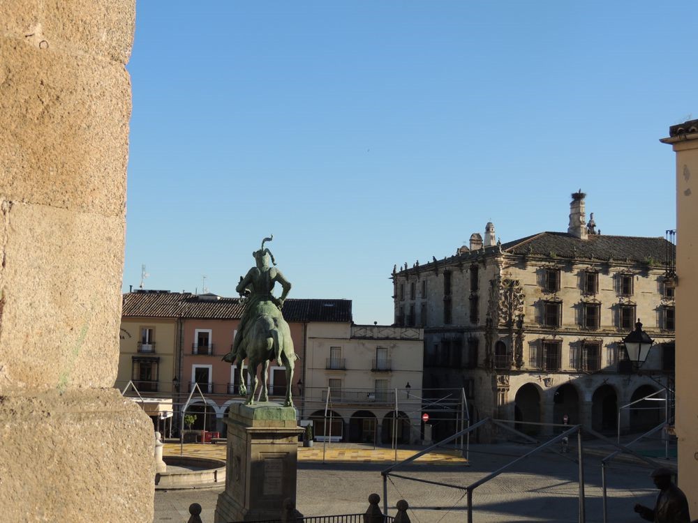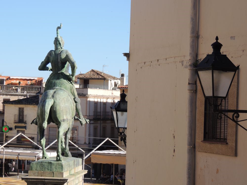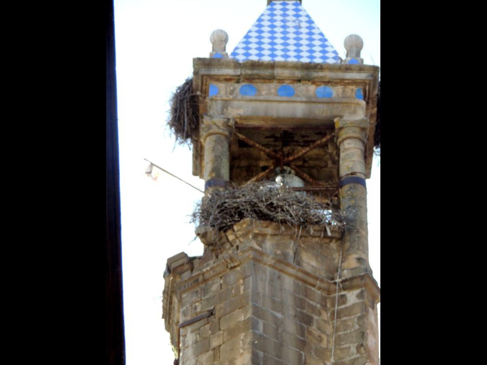 Trujillo's Parador was once a convent. A large building with a central courtyard, there were many artifacts from times past in the hallways. There were garden spaces which would have been perfect for times of contemplation. My first attempt at leaving the Parador to go and explore the town was unsuccessful because it was difficult to figure out the correct direction to travel once outside. In my first attempt at finding my way, I went down a street which gave me a view of the town walls and of the castle but I knew that the main square was not in that direction. I tried another direction but because the streets were narrow and the buildings two and three stories tall, I couldn't tell if I was even close to going where I wanted to. On each street I saw different dogs... two greeted me from their balcony... one from a garden which was above street level. The dog that gave me giggles was the one that I found in a home just by the Parador. The dog barked at my passing but was hidden behind a gate and a footed screen. I just told it "It's okay, buddy" and it crawled under the screen to greet me at the gate. Too funny! I couldn't help but to sketch him... what a character! Soon after I completed a preliminary sketch, I went back into the Parador for a map of Trujillo... much good it did me. I was STILL confused as to which way to go because the streets went at all angles and didn't seem to match up with the map. Solution: I asked a couple of kids just coming home from school (I assume by the book bags). They directed me towards the church - Iglesia de San Martin - which was on the main square. A main feature of (you guessed it!) Plaza Mayor was the bronze statue of conquistador Francisco Pizarro on horseback. At the statue I met a Spanish family on vacation. I was able to help them by taking their photo towards Palacio del Marques de la Conquista and they helped me with directions to the castle plus an explanation of the sights I was seeing in the square. My walk to the castle started on the street behind the Oficino de Turismo (Casa de la Cadena y Torre de Alfiler). You entered the gated part of the city through the Puerto de Santiago. A sharp right turn led you further up the hill to the Castillo Arabe Trujillo. From the grounds in front of the castle, you could look out over the walls to the Plaza Mayor and far beyond. On the tops of different spires and towers, more huge nests (and their occupants) could easily be seen. It was time to return to the Parador for dinner. Looking at things from a reverse angle as I retraced my steps, I realized that there was a lot I'd missed on the walk up to the castle.
