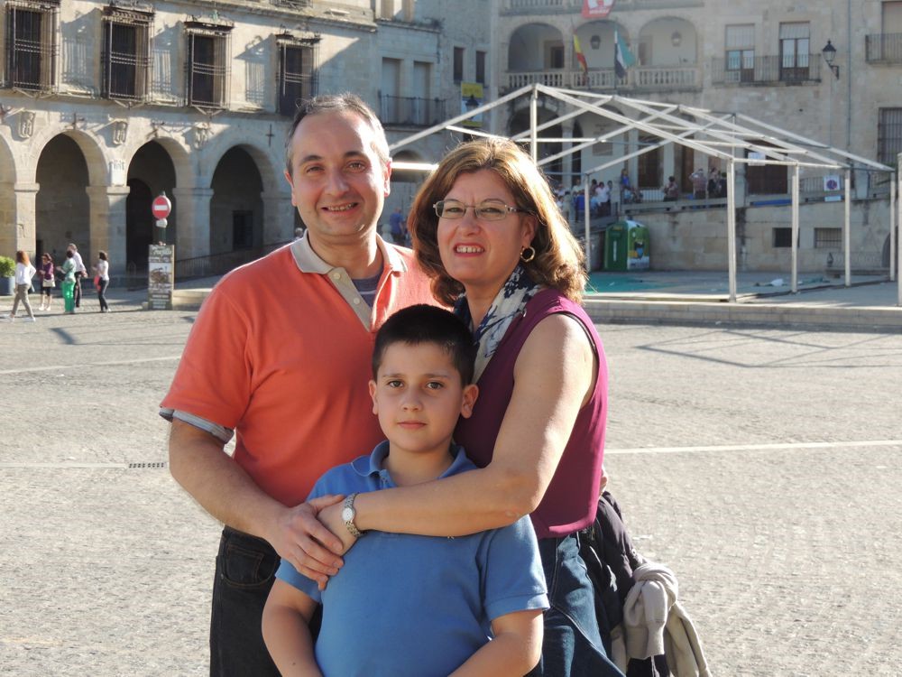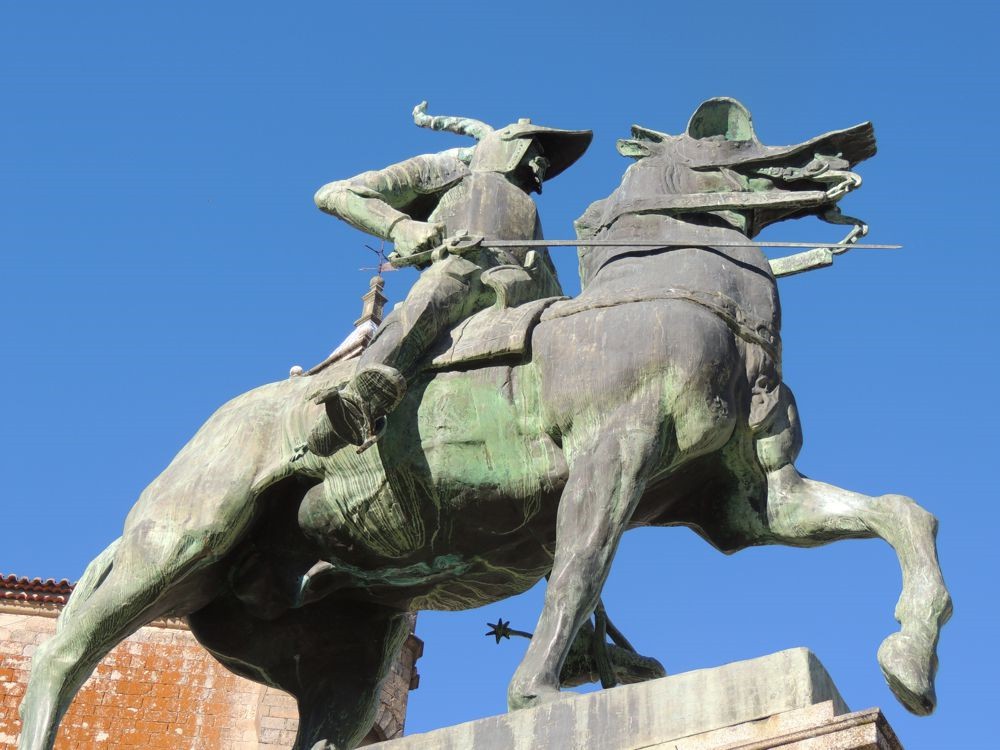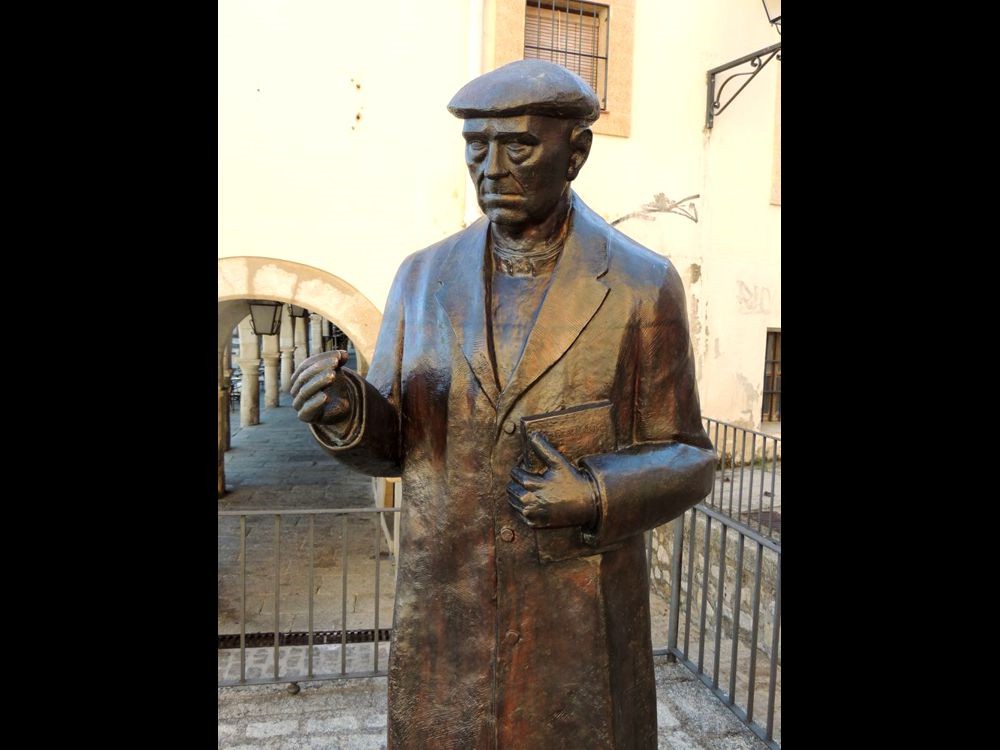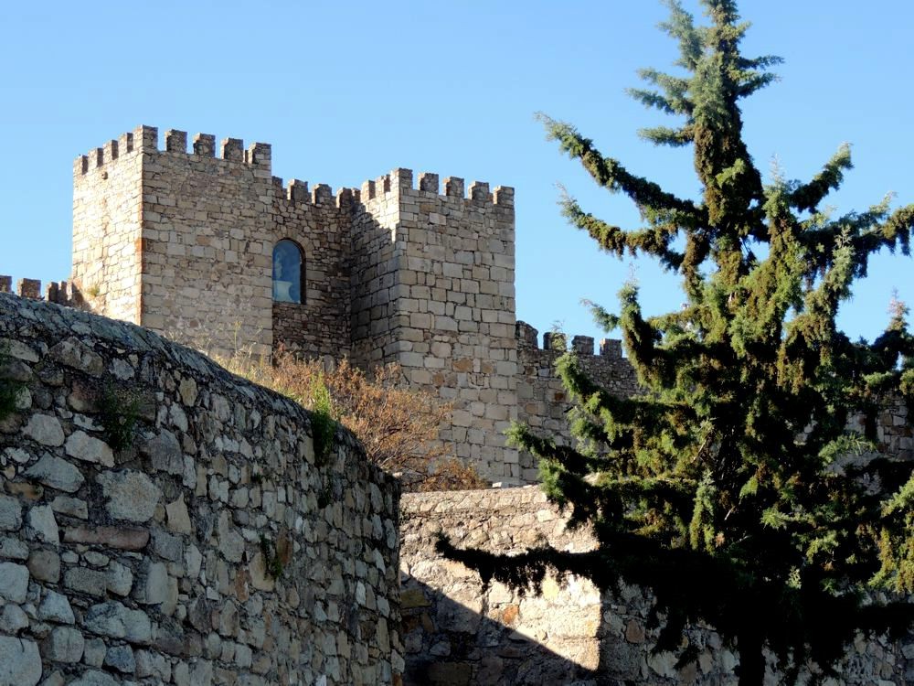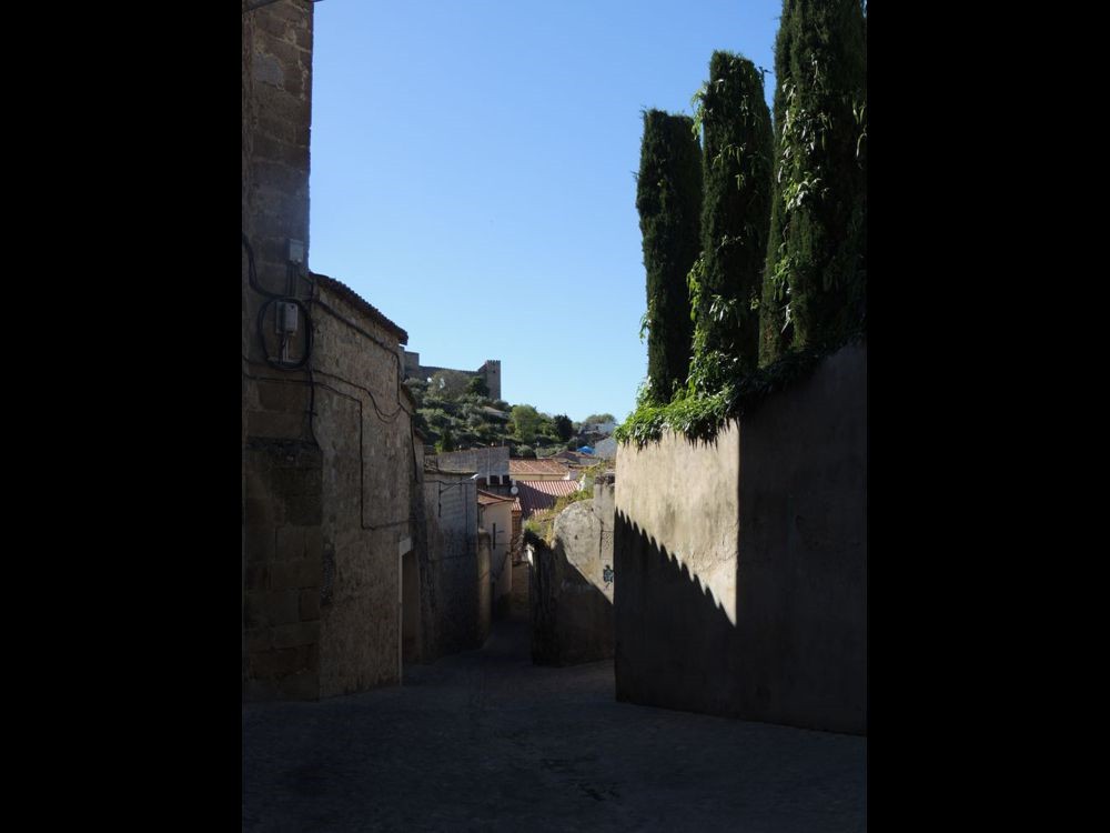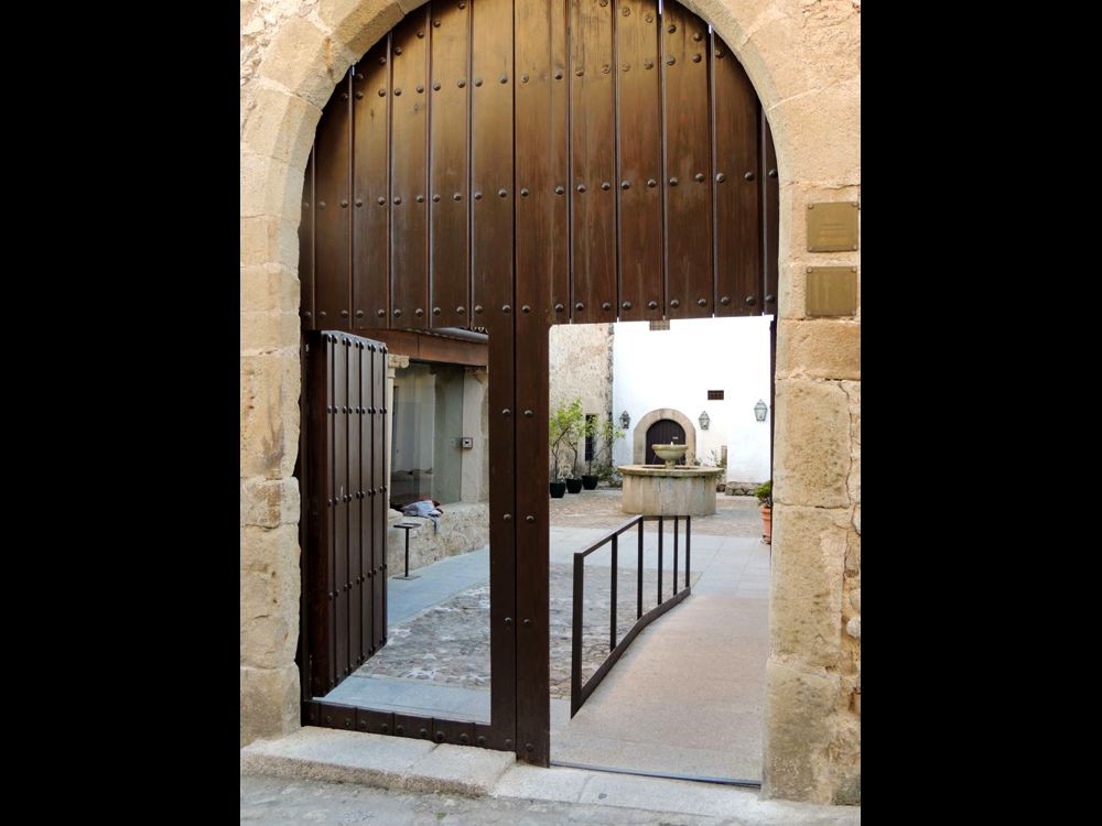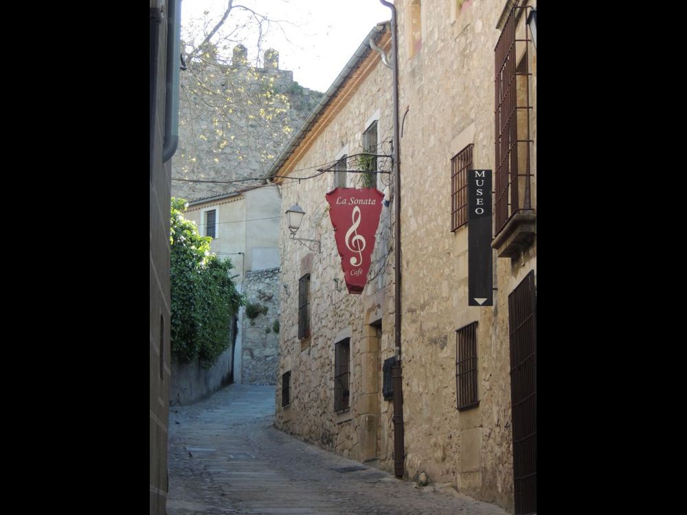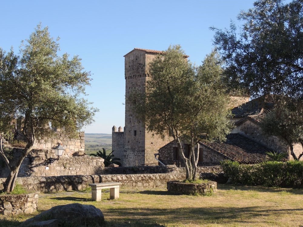 Trujillo's Parador was once a convent. A large building with a central courtyard, there were many artifacts from times past in the hallways. There were garden spaces which would have been perfect for times of contemplation. My first attempt at leaving the Parador to go and explore the town was unsuccessful because it was difficult to figure out the correct direction to travel once outside. In my first attempt at finding my way, I went down a street which gave me a view of the town walls and of the castle but I knew that the main square was not in that direction. I tried another direction but because the streets were narrow and the buildings two and three stories tall, I couldn't tell if I was even close to going where I wanted to. On each street I saw different dogs... two greeted me from their balcony... one from a garden which was above street level. The dog that gave me giggles was the one that I found in a home just by the Parador. The dog barked at my passing but was hidden behind a gate and a footed screen. I just told it "It's okay, buddy" and it crawled under the screen to greet me at the gate. Too funny! I couldn't help but to sketch him... what a character! Soon after I completed a preliminary sketch, I went back into the Parador for a map of Trujillo... much good it did me. I was STILL confused as to which way to go because the streets went at all angles and didn't seem to match up with the map. Solution: I asked a couple of kids just coming home from school (I assume by the book bags). They directed me towards the church - Iglesia de San Martin - which was on the main square. A main feature of (you guessed it!) Plaza Mayor was the bronze statue of conquistador Francisco Pizarro on horseback. At the statue I met a Spanish family on vacation. I was able to help them by taking their photo towards Palacio del Marques de la Conquista and they helped me with directions to the castle plus an explanation of the sights I was seeing in the square. My walk to the castle started on the street behind the Oficino de Turismo (Casa de la Cadena y Torre de Alfiler). You entered the gated part of the city through the Puerto de Santiago. A sharp right turn led you further up the hill to the Castillo Arabe Trujillo. From the grounds in front of the castle, you could look out over the walls to the Plaza Mayor and far beyond. On the tops of different spires and towers, more huge nests (and their occupants) could easily be seen. It was time to return to the Parador for dinner. Looking at things from a reverse angle as I retraced my steps, I realized that there was a lot I'd missed on the walk up to the castle.