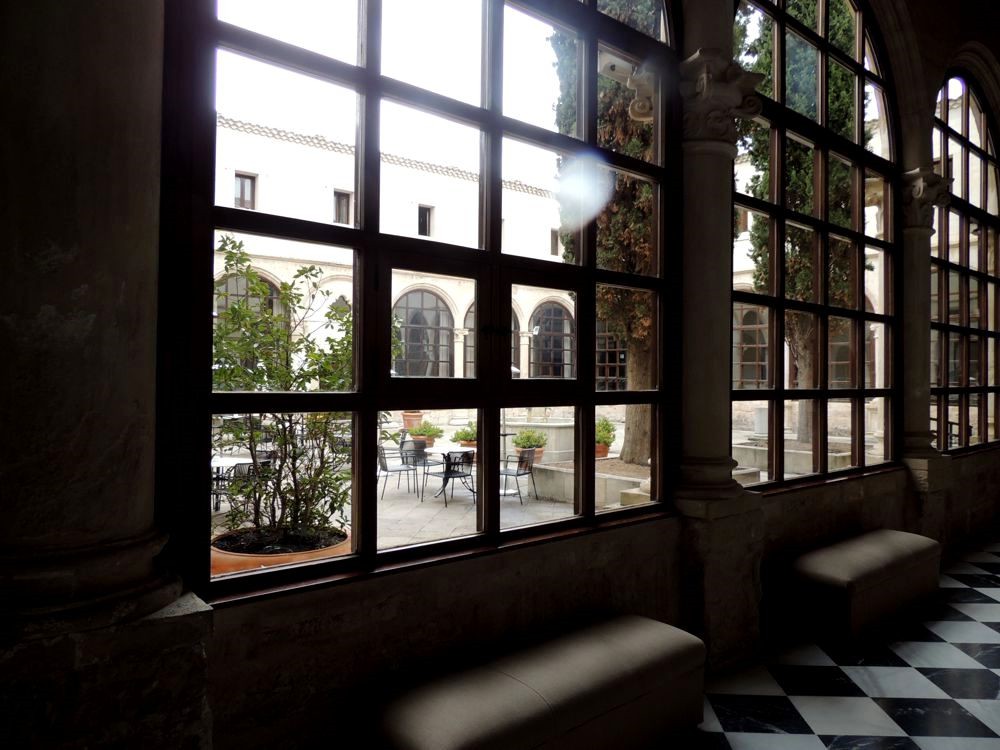 We had to ride down then up a mountain to get to the Parador de Cuenca. This parador was once a monastery and it was across a metal footbridge from the town of Cuenca. All the paradors had been beautiful but this ended up being my favourite. To me, it was just a tad classier than the others... maybe the "princess" bed helped... maybe the archways and window shapes... maybe the (mistakenly put in my room) treats awaiting our arrival... I just fell in love with it immediately.